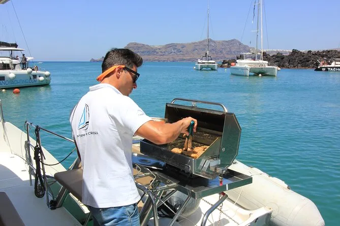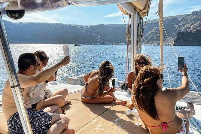 Your day includes pickup from your accommodation in Santorini, all entry fees and taxes covered up front, towels ready on board plus WiFi if you want it (though most people forget about their phones). Drinks flow from an open bar—wine or soda—and after swimming stops at Red Beach or soaking in hot springs near the volcano caldera, you’ll sit down to a traditional Greek lunch before heading back toward Vlychada port in the afternoon.