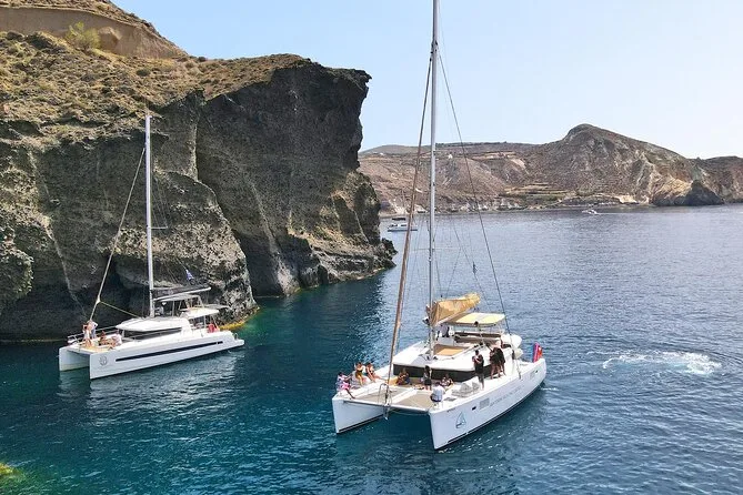 You’ll step aboard a Santorini catamaran with open bar service and cruise past Red Beach’s wild cliffs before swimming at White Beach and soaking in volcanic hot springs. Enjoy a traditional Greek lunch at Mesa Pigadia Beach with time to relax or snorkel before sailing back along the Caldera’s dramatic rim—leaving you with salt in your hair and one of those slow smiles you can’t quite shake off.