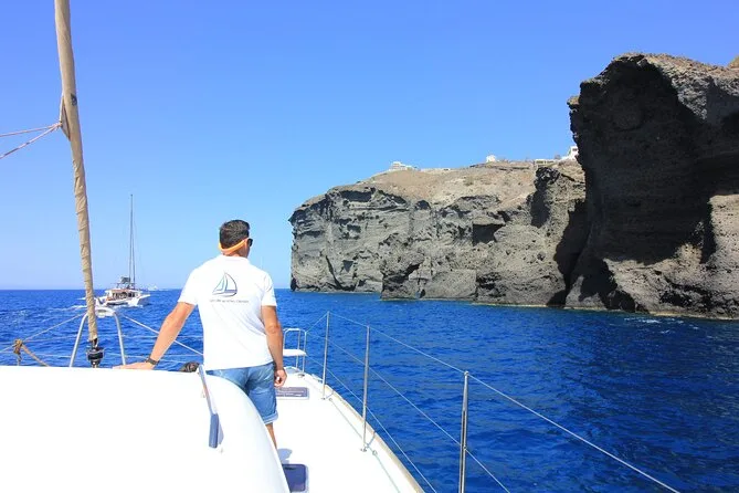 First thing I remember is the salty air hitting my face as we stepped onto the catamaran at Vlychada port — you could already smell grilled something from somewhere, maybe another boat. Our guide, Yiannis, grinned and handed out towels like he’d done this a thousand times but still found it funny when someone slipped on deck (me, obviously). The water was that unreal blue you only get around Santorini, and honestly, I nearly dropped my phone trying to catch the first glimpse of Red Beach. It’s not just red — more like rust and burnt orange cliffs crumbling into the sea. We stopped there for a swim; I didn’t expect the pebbles to be so warm underfoot.