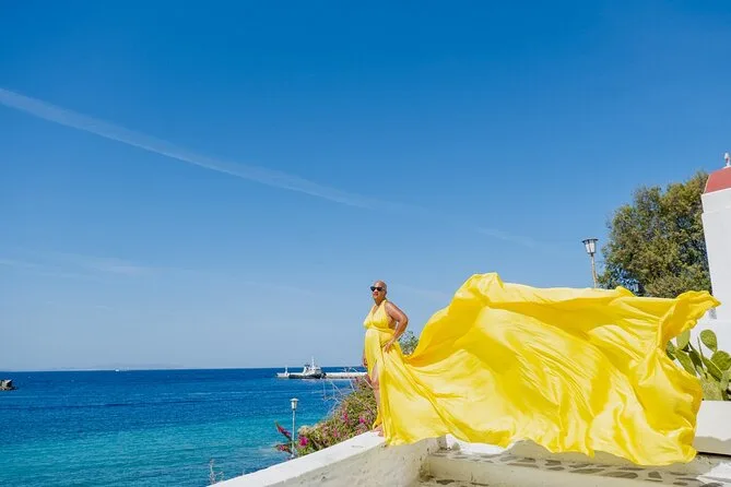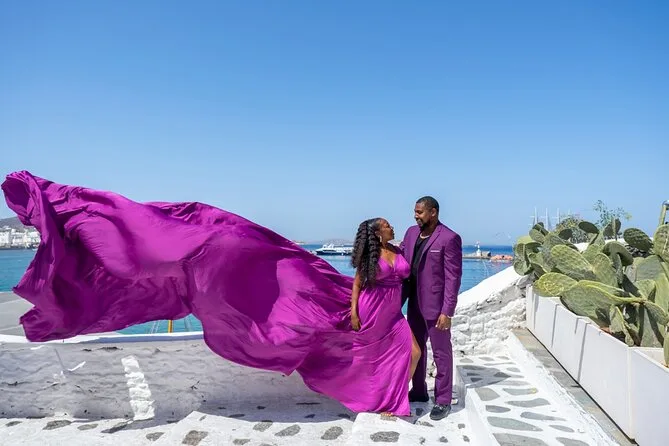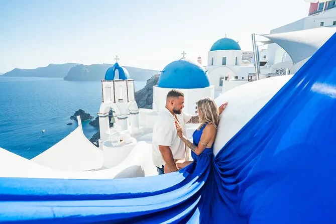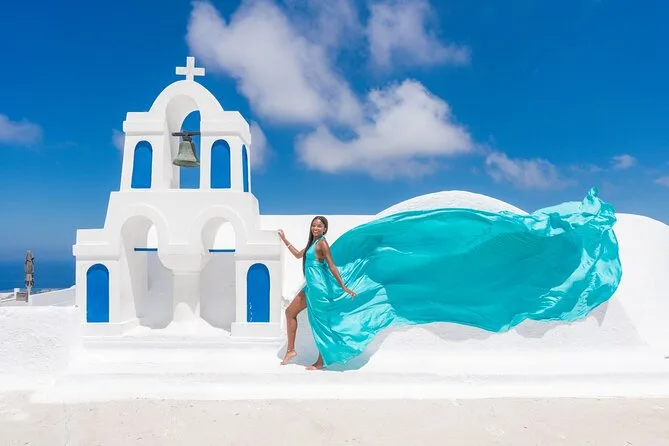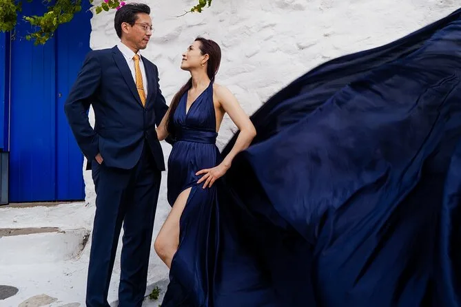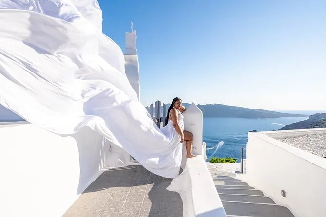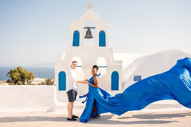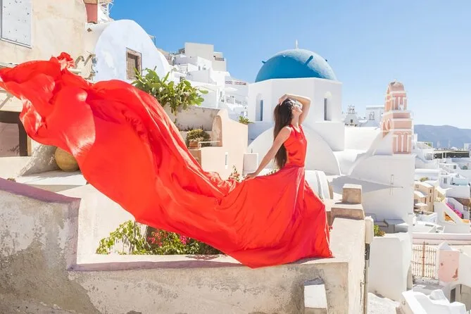 Your day includes pickup from Oia or Imerovigli (other locations possible with extra charge), a private session at iconic spots like the blue domes and caldera viewpoints, help choosing from 16 colors of handmade flying dresses, an assistant who makes your gown fly for each shot, plus 50 professionally edited photos delivered within a week after your shoot.