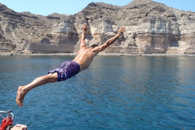 Salt on my lips, sun on my shoulders—right from Vlychada port, the morning felt easy. The crew greeted us with that effortless Greek warmth you hear about, and before I knew it, we were gliding past the wind-carved cliffs. The water had that deep blue color you only see in postcards, but it’s real here. I could smell the sea mixed with a faint whiff of grilled tomatoes from a nearby taverna as we set off.