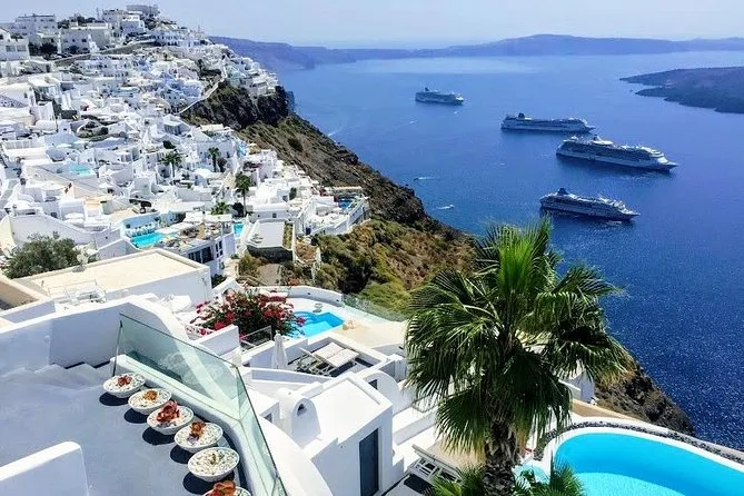 The tour visits Oia, Imerovigli, Firostefani, Megalochori, and Perivolos Beach.