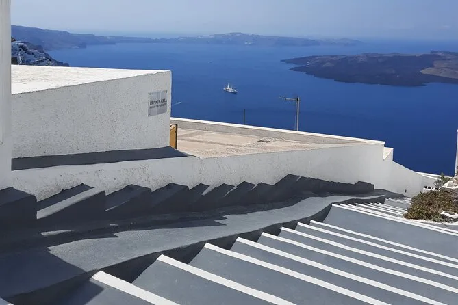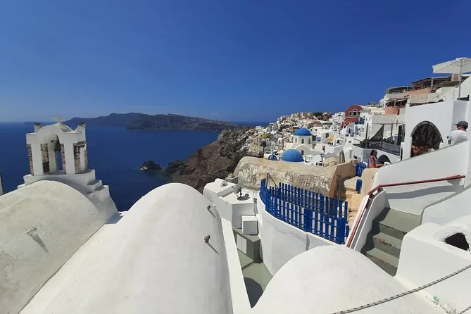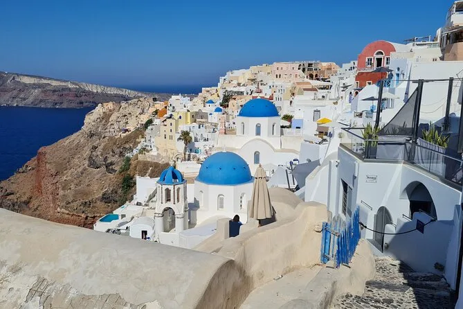 I never thought I’d start my day with the smell of coffee drifting out from a tiny café in Firostefani, but that’s where our guide Dimitris waved us over. He knew everyone — or it seemed like it. The village felt half-asleep, cats stretching on whitewashed steps, sun just starting to glare off those blue domes. We wandered narrow lanes and Dimitris pointed out the “crown” of Fira below us. I tried to take a photo but honestly, no camera gets that light right. It’s almost too bright — you have to squint and then laugh about it.