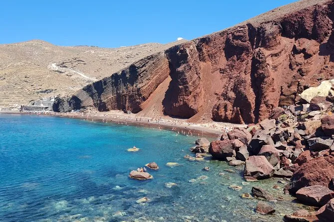 The itinerary includes stops at both Red Beach and Black Sand Beach (Perissa/Perivolos).