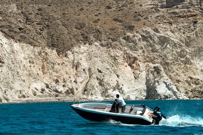 Your day includes use of a brand-new motorboat (no license required), bottled water to keep you cool under the sun, light snacks for when hunger hits after swimming or exploring Nea Kameni or Thirasia Island, plus masks and snorkels if you want them—just ask before setting out.