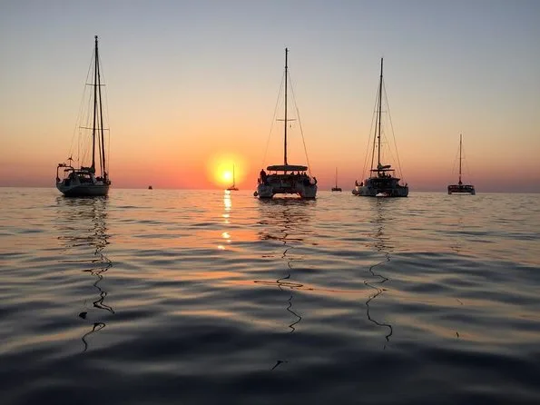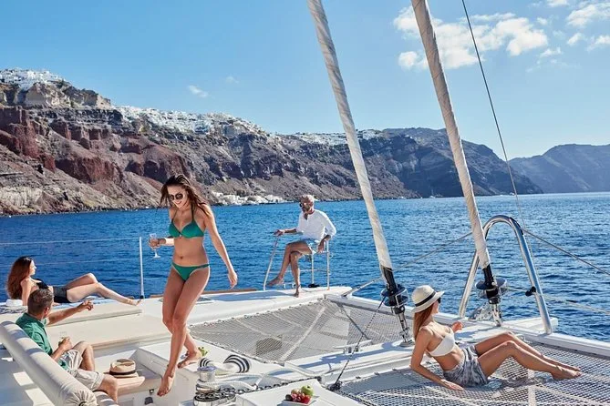 You’ll sail Santorini’s coast on a spacious catamaran with a small group, swimming at Red and White Beaches before sharing a fresh Greek BBQ lunch onboard. Your local guide handles everything from snorkeling gear to stories about volcanoes, leaving you free to watch sunset colors spill across the caldera as you sip Santorinian wine.