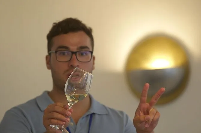You’ll taste 12 wines—mainly crisp whites like Assyrtiko, plus some reds and dessert wine.
