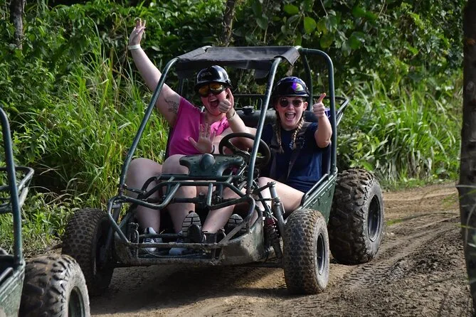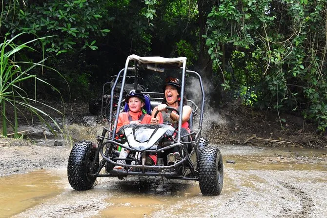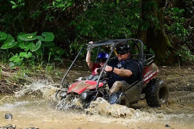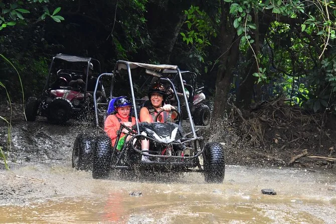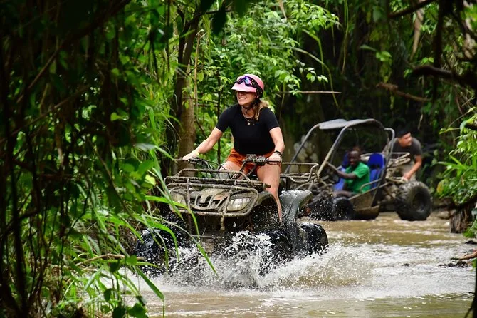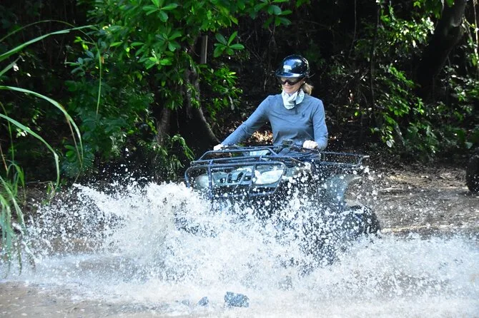 Your day covers use of ATVs or dune buggies (with helmets, goggles, bandannas), entry to Mayan Eden Eco Park for wildlife encounters, guidance from bilingual locals throughout every stop, plus lunch at Pristine Bay Beach Club before heading back — all taxes included too.