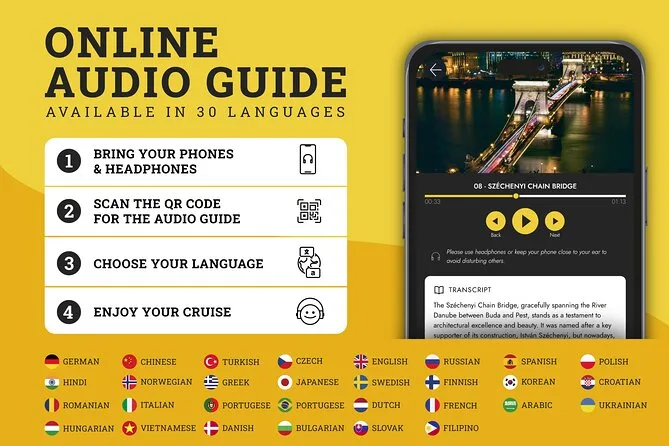 Your hour-long Budapest Danube cruise includes guaranteed seating aboard a period-style paddle steamer (first-come basis), a welcome drink of Tokaj sparkling wine or orange juice, access to restrooms and free Wi-Fi onboard, plus an online audio guide in 30 languages—just remember your earphones. There’s also table service for extra drinks or snacks (cash/card accepted), blankets if it gets chilly outside, umbrellas or parasols for weather changes—and yes, dogs are welcome as long as they’re leashed.