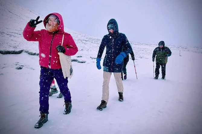 You should bring layered waterproof clothing, sturdy hiking shoes, water, snacks, gloves, and your phone or camera.