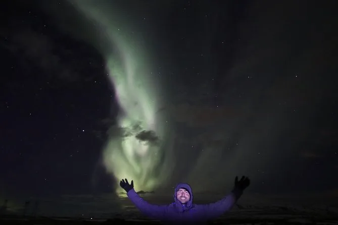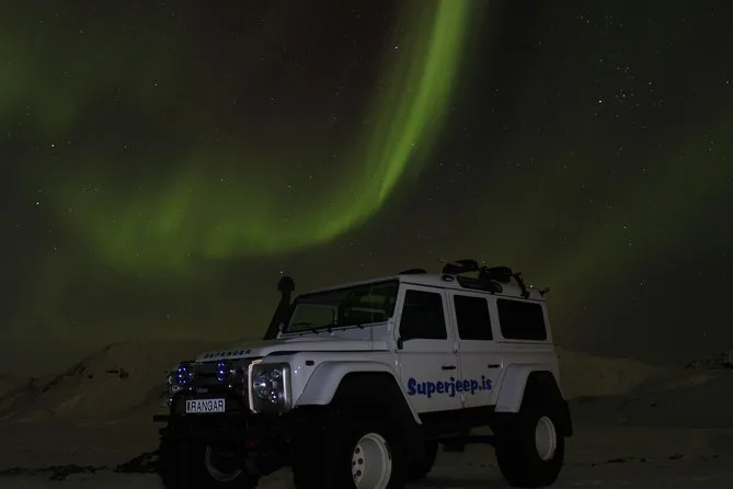 I’ll be honest—I thought we’d just park somewhere and wait. But it felt more like a hunt. We met up with two other superjeeps, headlights bobbing on the horizon like slow-moving stars. Everyone piled out into crunchy snow; my boots squeaked with every step and my breath hung thick in the air. Jón handed out hot chocolate—he said it keeps your hands warm even if your nose goes numb (he was right). Then someone gasped and pointed, and there it was: a pale green ribbon unfurling across the sky. Not bright at first, but shifting and stretching until it looked almost alive. I tried to take photos but mostly just stood there with my mouth open. Jón snapped a picture of us with the lights behind—he promised to send it for free, which still feels wild.