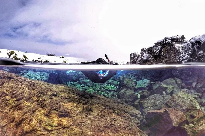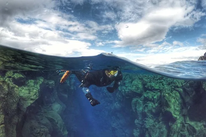 Your day includes meeting your certified PADI Divemaster guide at Thingvellir (self-drive only), full use of drysuit gear with thermal undersuit plus mask, snorkel and fins—all fitted before entering Silfra fissure—plus free GoPro photos sent by email after your swim and hot drinks with chocolate once you’re back on land.
