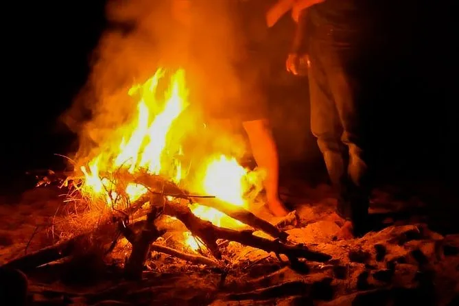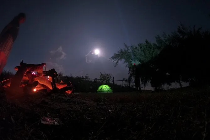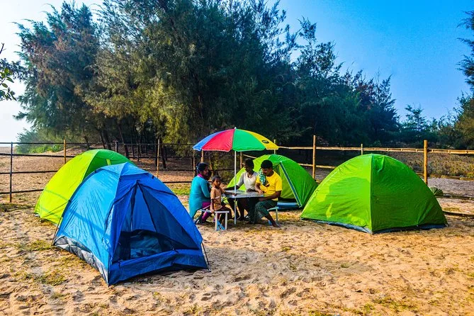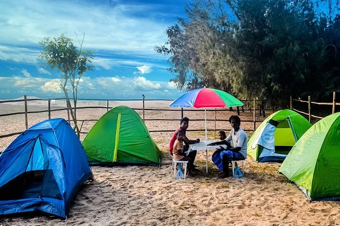 You’ll get tents and sleeping bags set up right on the sand, access to toilets (basic but clean), dinner (usually fresh fish curry), breakfast in the morning, plus games like volleyball and frisbee to keep things lively.
