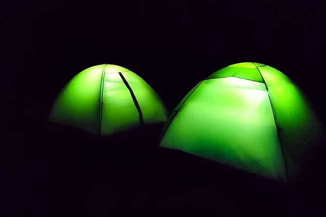 The campsite is basic—no regular electricity—but we use lanterns and solar lights at night.