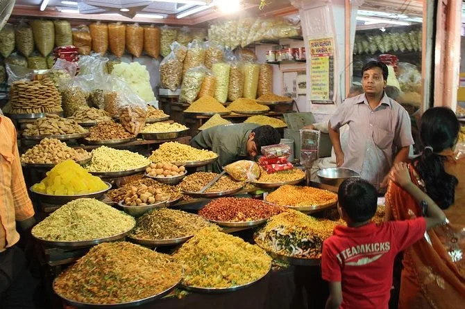 You sample samosas, kulfi (ice cream), lassi (yogurt drink), and traditional Indian sweets from popular mithai shops.