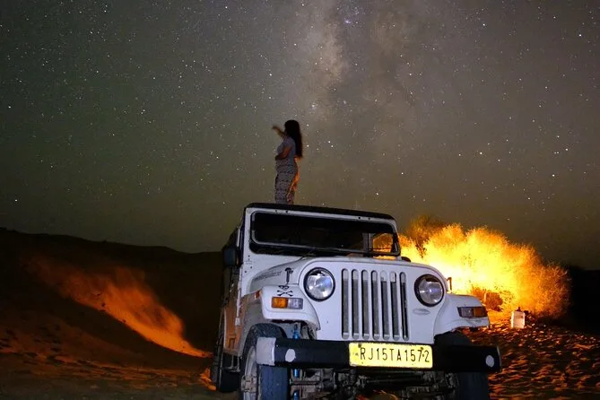 Your overnight trip includes pickup from your hotel in Jaisalmer or another meeting point by jeep transfer to the starting point, all vegetarian meals freshly cooked by your guides (breakfasts, lunch and dinner), plenty of chai breaks along the way, two guided camel rides through varied Thar Desert scenery including stops at an oasis and Khaba Fort on return—and sleeping outside under open sky with beddings provided before being dropped back late morning in Jaisalmer.