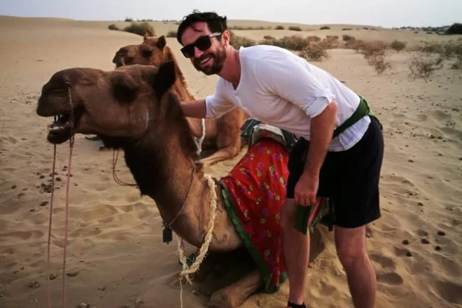 Sunset camel ride in Rajasthan desert with village stop and dinner