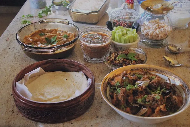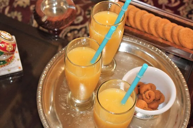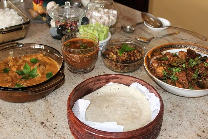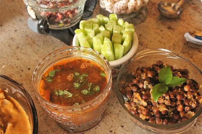 Your private day includes all fees and taxes plus a full home-cooked meal featuring regional Karnataka dishes prepared by Devika using family recipes; you’ll enjoy welcome drinks (alcoholic or non-alcoholic), snacks like pakoras on arrival, main courses such as dry roasted chicken or vegetable curry with flatbread or rice, salad and pickle sides, plus traditional payasam dessert before lingering over tea together at her Mysore home.