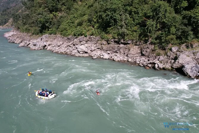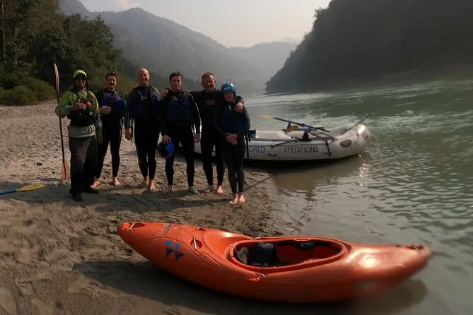 Your day includes pickup from White World Expeditions office to Marine Drive where your guide outfits you with helmet, paddle, wetsuit and dry bag for valuables before hitting 26km of Ganga rapids together; after paddling there’s soft drinks, cookies or tea at NIM Beach plus return transport back to base — all led by certified river crew with a safety kayaker alongside.