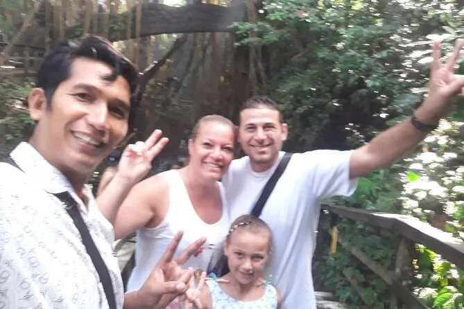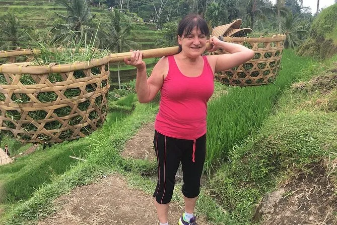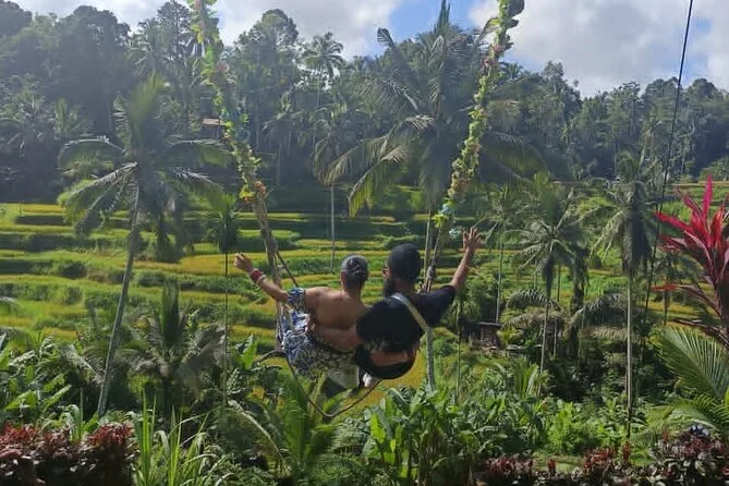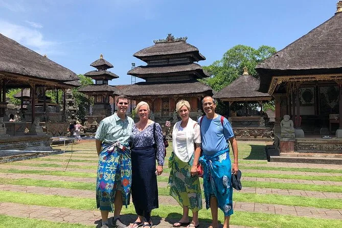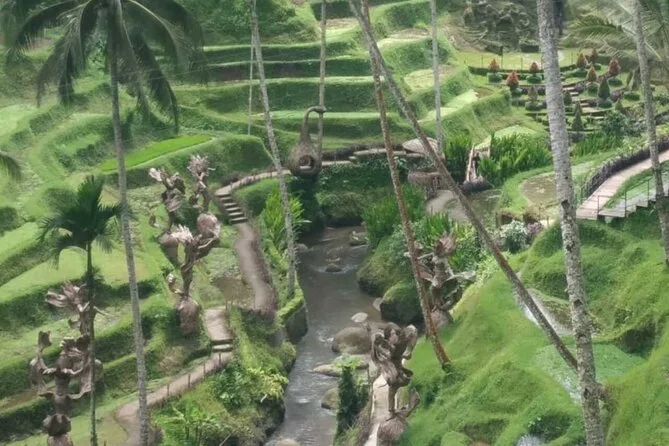 The tour visits Batuan Temple, Tegenungan Waterfall, a coffee plantation near Ubud, Tegalalang Rice Terrace, Celuk Village for silver jewelry, and batik workshops.