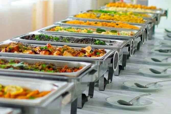 The buffet lunch offers both vegetarian and non-vegetarian choices typical of Indonesian cuisine.