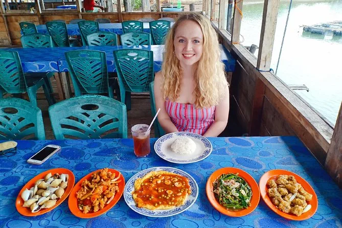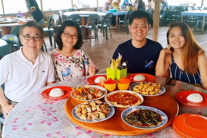 Lunch comes next — a short ride to a kelong restaurant built right over the water. The wooden planks creak under our feet and there’s this salty smell mixed with frying garlic coming from the kitchen. We get a set menu (seafood everything), and I’m not sure what half of it is but it tastes fresh and spicy. Someone jokes about getting used to eating fish with your hands here; honestly, after that meal I don’t mind. Before heading back, we stop at a little souvenir shop — lots of hand-carved stuff and woven bags. I try bargaining for a keychain and probably pay too much but whatever, it makes me smile when I see it now.