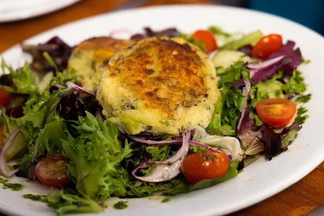 You get two courses: options include traditional beef stew with vegetables or vegan/vegetarian colcannon potato cakes, plus desserts like Baileys cheesecake or strawberry sorbet.