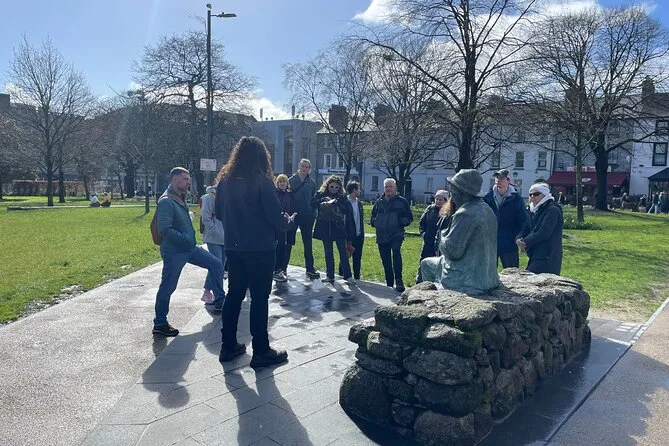 Someone waves us over near the Browne family doorway—turns out it’s our guide, Aoife, who seems to know half the city by name. She starts right away with a story about Eyre Square that I’d never have noticed myself (apparently that random old doorway was once the park’s gateway). The flagpoles catch the morning light and she points out which ones belong to Galway’s “Tribes”—I didn’t realize how much history is hiding behind those names. There’s this statue everyone takes photos with, but Aoife tells us why it matters. I still think about how she made it feel personal instead of just another landmark.