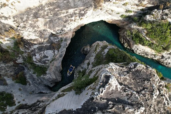 La Baia di Bristan nascondeva vecchi bunker tra le colline—Arben ci ha raccontato dei tempi comunisti, indicando tunnel quasi inghiottiti dall’erba. Dopo siamo entrati nel Canyon Segreto, dove le rocce si stringono e tutto si fa silenzioso, tranne gli schizzi e qualche risatina nervosa (forse la mia). La “Grotta Azzurra” in sé sembrava irreale—solo pietra frastagliata e quel colore impossibile. Ho provato a fare una foto, ma davvero non rende giustizia.