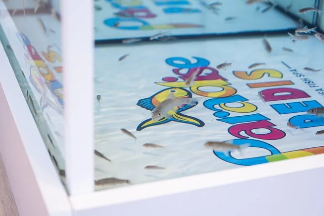 Nelle vasche ci sono i pesci Garra rufa, noti come “pesci dottori” per l’esfoliazione delicata.