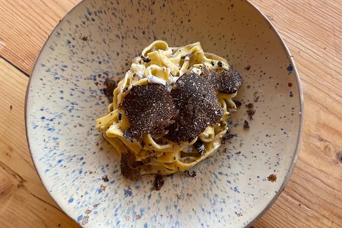Gusterai pasta fatta a mano con crema al tartufo nero, guarnita con tartufi freschi e parmigiano.
