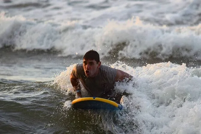 Con le tavole sotto il braccio, abbiamo camminato per una decina di minuti lungo un sentiero sabbioso. Le onde si sentivano prima ancora di vederle—costanti e invitanti. La spiaggia si divide in due zone: vicino alla riva per i principianti (la “zona interna”), e più lontano per chi ha già dimestichezza con la tavola (la “zona esterna”). Io ho iniziato nella zona interna; il mio amico è andato più lontano con un altro istruttore. I gruppi erano piccoli—solo tre persone per coach—così l’esperienza era molto personale. Dopo ogni tentativo ricevevamo molti consigli; a volte cadevi e ti ritrovavi a ridere con l’acqua salata nel naso, ma imparavi sempre qualcosa di nuovo.