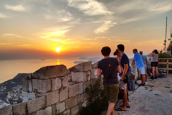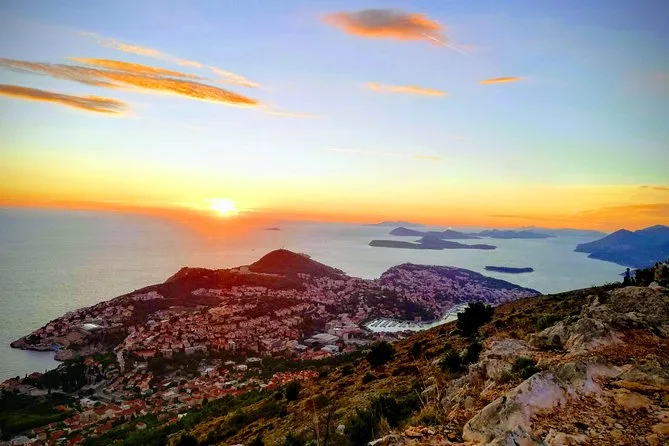 Goditi il miglior tramonto di Dubrovnik dal Monte Srd dopo aver esplorato i luoghi più belli della città e angoli nascosti, con un bicchiere di vino croato in mano. Un mix perfetto di storia, panorami e sapori autentici per una serata rilassante.