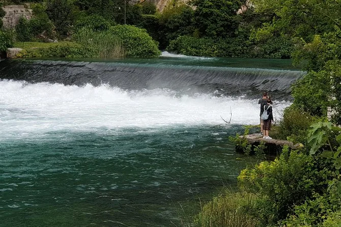 La tappa successiva è stata la sorgente del fiume Ombla. Facile da perdere se non la cerchi: un piccolo angolo verde dove l’acqua sgorga da sotto la montagna. La senti prima di vederla. Vicino ci sono delle rovine: una vecchia casa estiva che un tempo apparteneva a Marin Držić, il famoso poeta di Dubrovnik (la guida ci ha detto che qui scriveva d’estate). L’acqua è gelida anche a luglio; alcuni locali riempiono bottiglie direttamente dalla fonte.