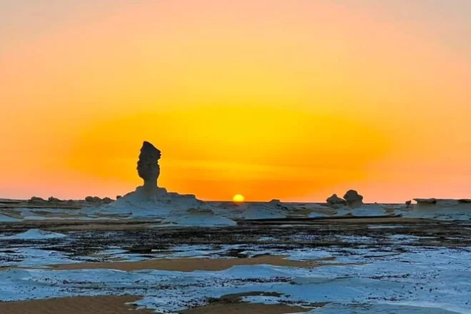 A mezzogiorno siamo arrivati nella Valle di Agabat. Lì c’è un silenzio strano — niente uccelli, nessuna macchina, solo vento e il rumore dei nostri passi sulla sabbia chiara. Mahmoud ha riso quando ho provato a pronunciare “Agabat” correttamente (ho mollato). Le scogliere bianche sembravano di un altro pianeta. Poi è arrivato il Deserto Bianco: forme calcaree ovunque, alcune sembrano funghi o cammelli se guardi con attenzione. Abbiamo montato il campo mentre il tramonto tingeva tutto d’oro. La cena era pollo alla griglia sulle braci e riso speziato — onestamente, qui il cibo ha un sapore tutto suo. Dormire all’aperto all’inizio sembrava strano, poi mi sono perso a guardare il cielo per ore; c’erano così tante stelle da far girare la testa.