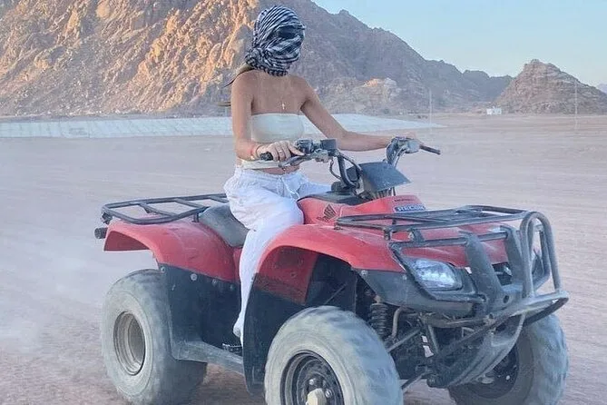 Il tour include pick-up e drop-off in hotel a Hurghada, l’uso del quad nel deserto con due soste panoramiche, più una pausa in un campo beduino per assaggiare il tè locale prima del ritorno.