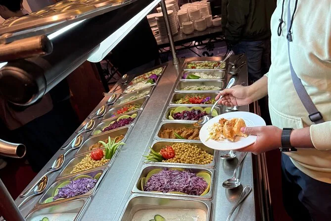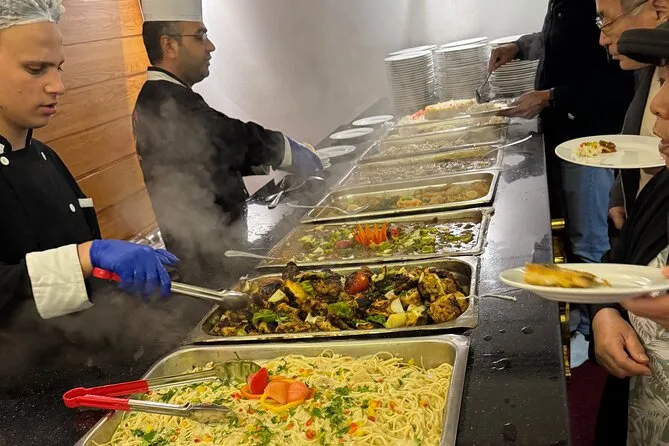 Per quanto riguarda il cibo? Il buffet offriva più scelte di quante ne potessi mettere nel piatto. Alcuni piatti li conoscevo, altri li ho provati al buio — ancora non so cos’era quella salsa verde ma stava benissimo con il pane. In sottofondo c’era musica dal vivo; ogni tanto si sentivano frammenti di conversazioni in arabo o inglese che fluttuavano nell’aria. Non sembrava un evento, ma piuttosto un modo per entrare nel modo in cui i locali si rilassano qui.