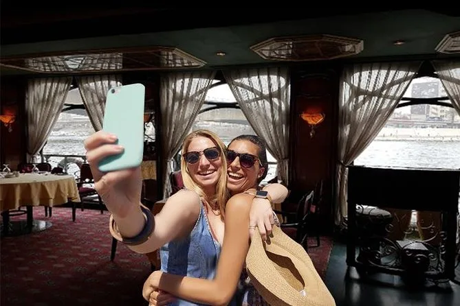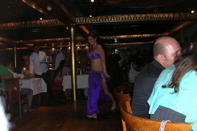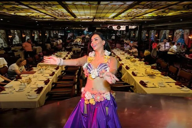 La tua serata include il pick-up in hotel al Cairo con autista privato o rappresentante, il trasferimento al porto sul Nilo, alcune ore a bordo di una comoda barca con cena a buffet di piatti egiziani (opzione vegetariana su richiesta), spettacoli di danza dal vivo con danze del ventre e Tannoura accompagnate da musica, più il rientro in hotel dopo aver navigato tra le luci della città.