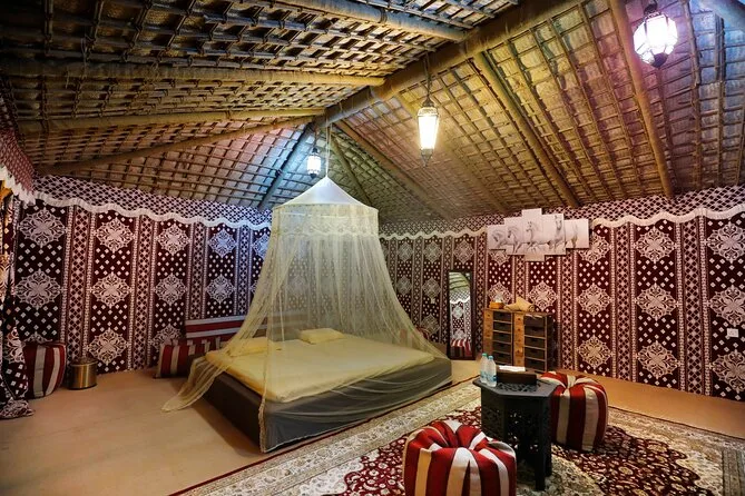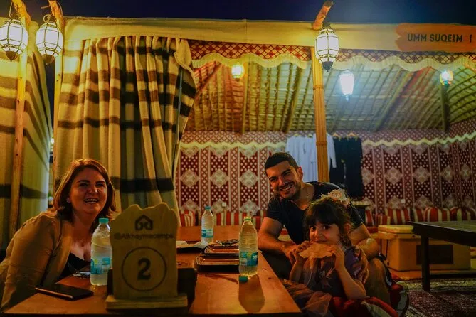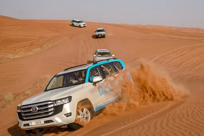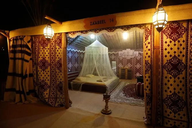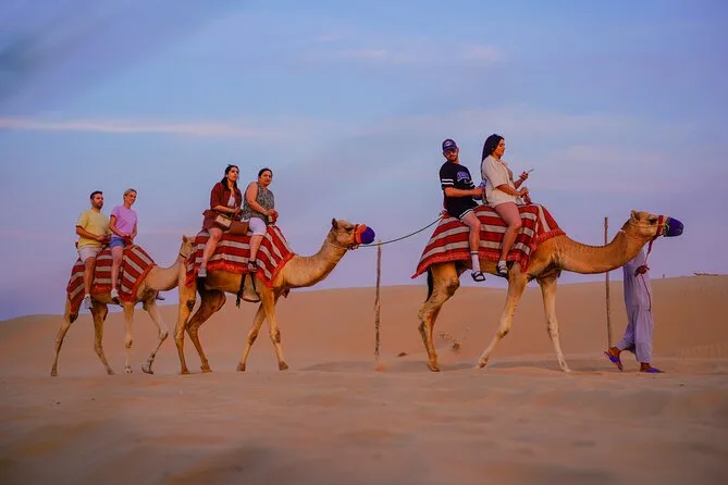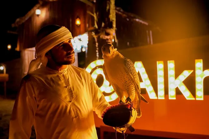 Il tuo safari notturno nel deserto include il pickup in un comodo 4x4, tutte le attività di dune bashing e sandboarding con guida autorizzata, brevi giri in cammello (compreso il trekking all’alba), uso della shisha, pittura all’henné per le donne, foto con i falchi, acqua e bibite illimitate più tè e dolci arabi all’arrivo. Godrai di una cena barbecue a buffet con spettacoli dal vivo prima di dormire nella tua tenda privata climatizzata ad Al Khayma Camp—e ti sveglierai con una colazione prima di tornare a Dubai.