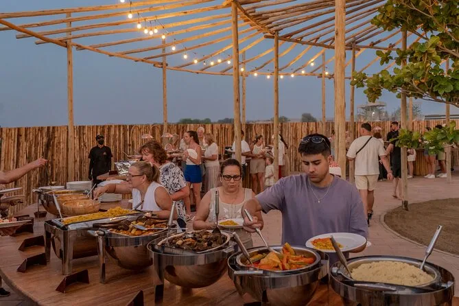 La cena a buffet offre piatti emiratini, marocchini e arabi preparati dal ristorante Al Khayma Heritage.