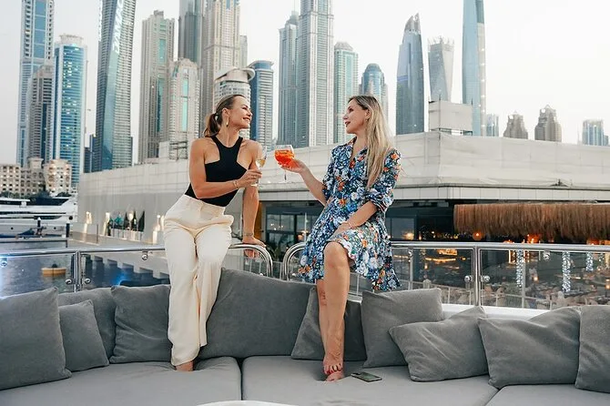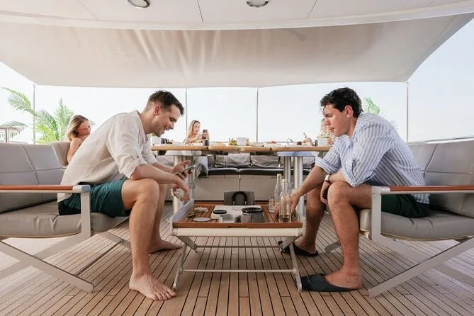 Salirai a piedi nudi su uno yacht Sunseeker a tre ponti nel porto di Dubai per una serata con sushi omakase, drink a volontà, DJ dal vivo e luci della città che scorrono. Ammira icone come Burj Al Arab e Palm Jumeirah mentre assaggi ogni piatto — a volte ridendo con sconosciuti, a volte perso nel panorama.