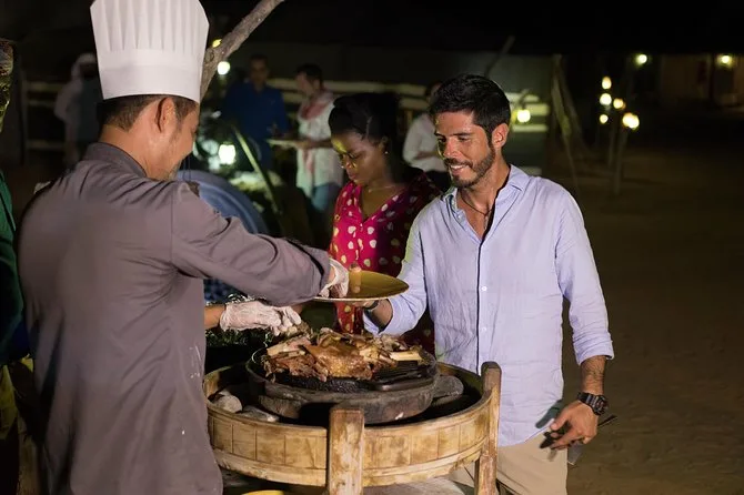 Il tuo giorno include il pick-up in hotel con veicolo climatizzato, ingresso alla Dubai Desert Conservation Reserve con kefiah e bottiglia d’acqua da portare a casa, un’ora di safari naturalistico in Land Rover vintage con guida esperta, dimostrazione di falconeria al tramonto, arrivo in un autentico campo beduino illuminato da torce con caffè arabo e datteri all’arrivo più dimostrazioni dal vivo di pane e caffè, cena tradizionale a quattro portate sotto il cielo aperto con spettacoli emiratini (tamburi e danza Yola), tatuaggio all’henné gratuito da un’artista locale, lounge shisha premium se vuoi provarla, brevi giri in cammello vicino al campo, sessione esclusiva di osservazione delle stelle dopo il tramonto riservata agli ospiti prima del rientro in hotel in tarda serata.