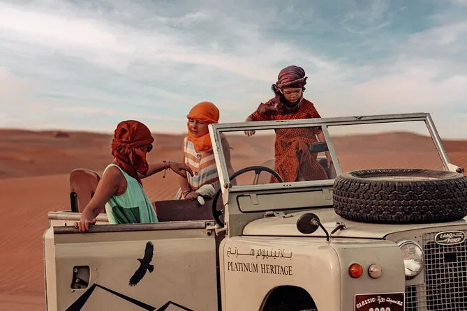 Attraversa le dune dorate a bordo di Land Rover vintage in questo safari nel deserto di Dubai, ammira i falchi al tramonto, gusta caffè arabo in un campo beduino illuminato da torce e condividi una cena tradizionale sotto il cielo aperto. Tra risate con i locali e momenti di silenzio sotto le stelle, questa notte ti resterà nel cuore molto tempo dopo il ritorno a casa.