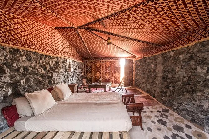 Si dorme in tradizionali abitazioni arabe di pietra con biancheria fornita (non ci sono docce).