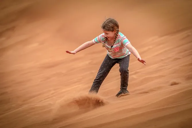 La mattina include pick-up in hotel o luogo scelto con 4x4 climatizzato, tutte le attività di dune bashing e sandboarding guidate da una guida locale autorizzata, quad opzionale se selezionato in fase di prenotazione, giri brevi in cammello (ripetibili), accesso a una tenda climatizzata con tè o caffè arabo, datteri e bibite prima del ritorno al punto di drop-off.