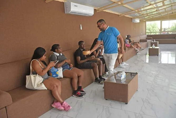 Sì, tè o caffè arabo con datteri, acqua e bibite vengono serviti in una tenda climatizzata.