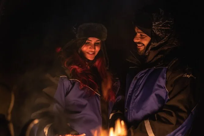 La serata include prelievo e rientro in hotel a Ivalo, abbigliamento termico e scarponi per affrontare il freddo della Lapponia, safari guidato in slitta trainata da motoslitta fino al Lago Inari, incontro con renne su un’isola abitata da una famiglia locale, e una cena lappone di tre portate con bevande calde intorno al fuoco prima del rientro nella notte innevata.