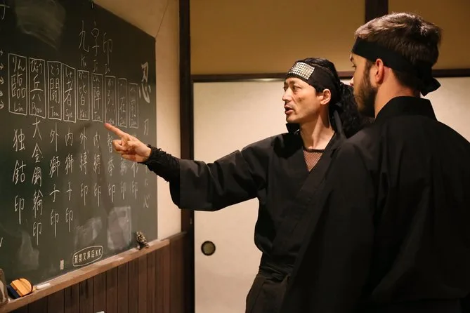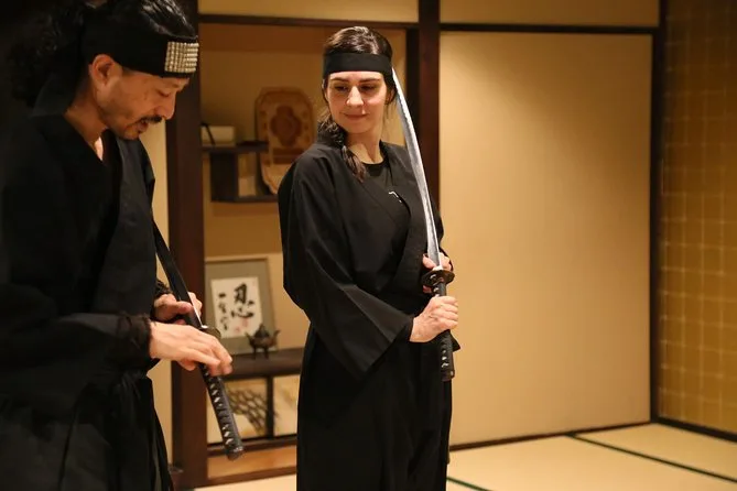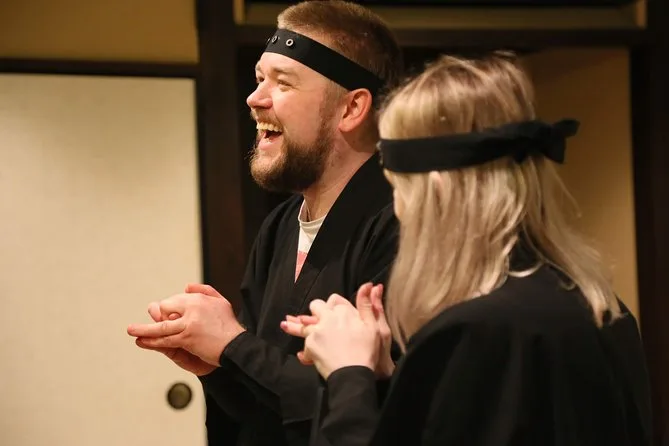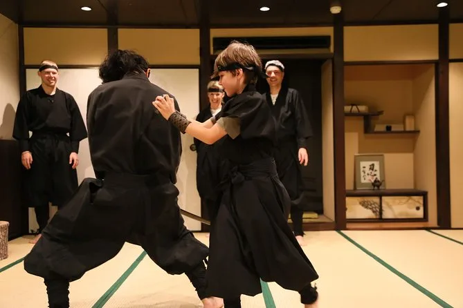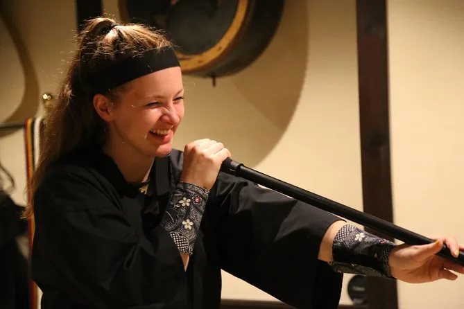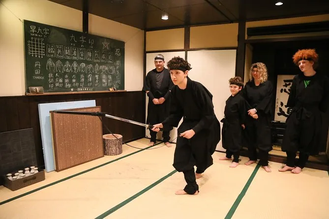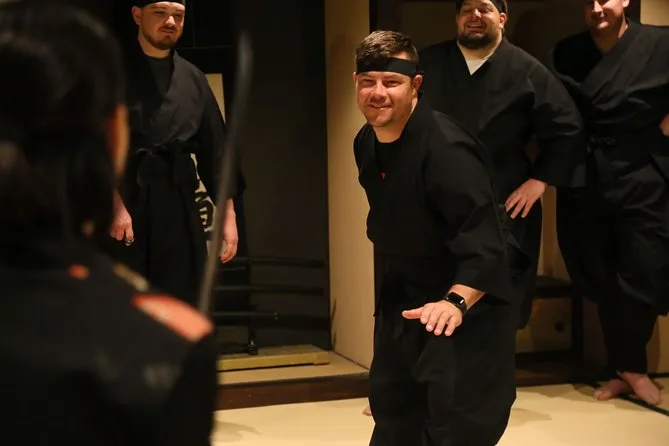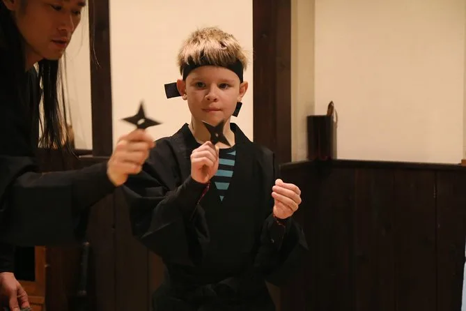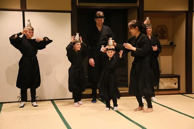 La tua ora include l’ingresso al dojo di Kyoto e il noleggio completo dell’abbigliamento ninja per la sessione. Un sensei giapponese che parla inglese guida tutte le attività — dalla meditazione all’uso delle armi — e potrai provare spade, pugnali kunai, shuriken e cerbottane prima di tornare a esplorare le strade di Kyoto.