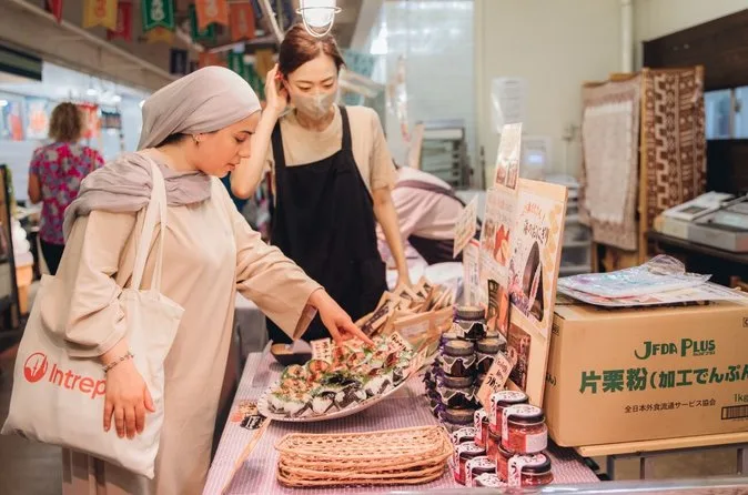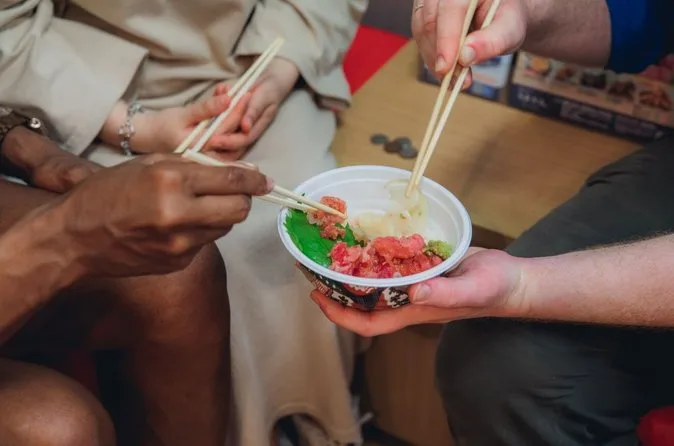 Assaggerai sushi fresco, snack giapponesi come anguilla alla griglia o spiedini di pesce, e dolci tradizionali wagashi.