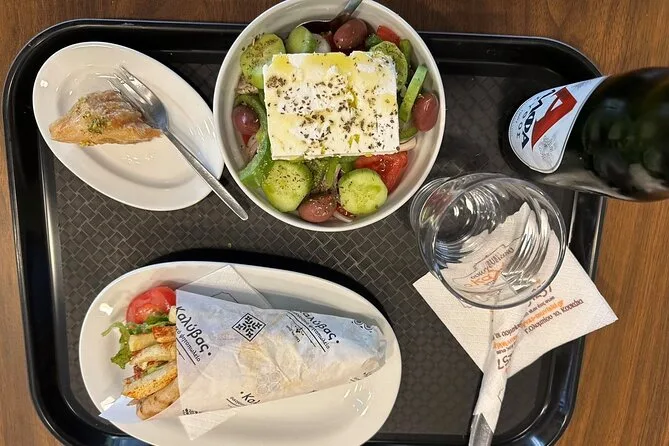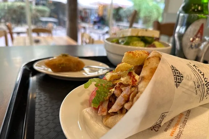 Sì, pranzerai in una taverna greca con pitta gyros (carne o vegetariano), insalata greca, baklava e una bevanda a scelta.